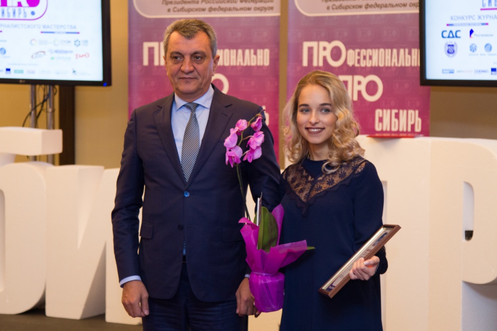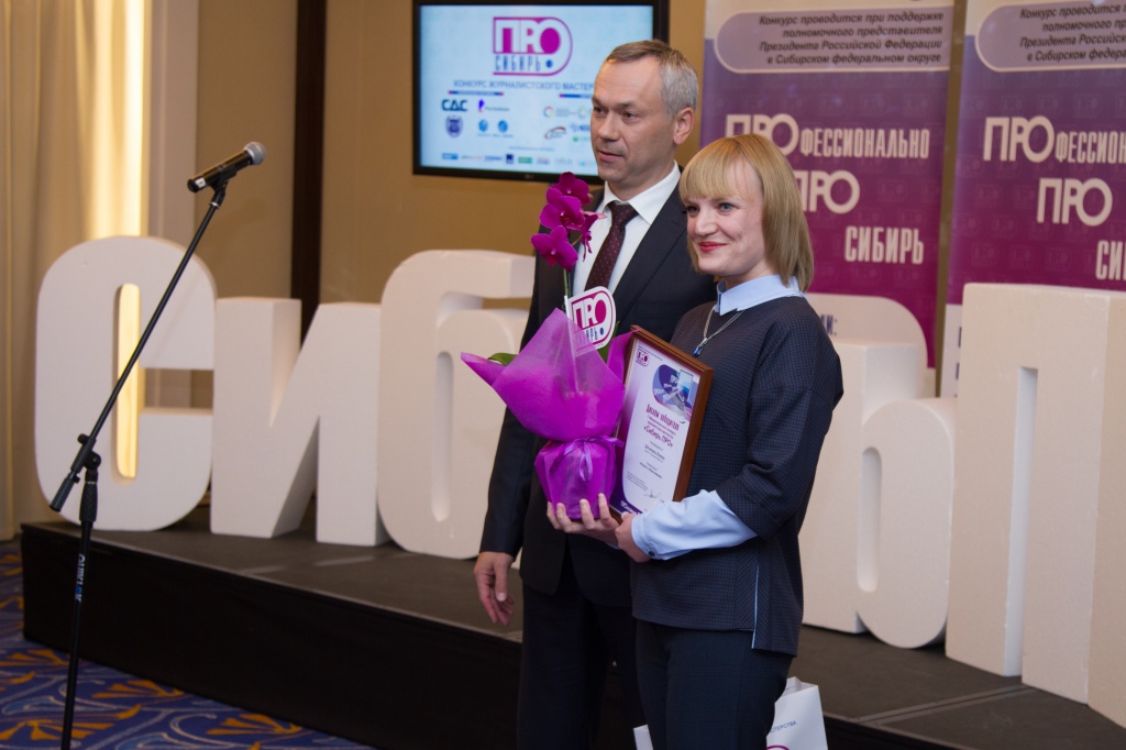 Андрей Травников вручил награду победителю номинации «Наука и образование» – Елене Штополь из газеты «Томские новости».
