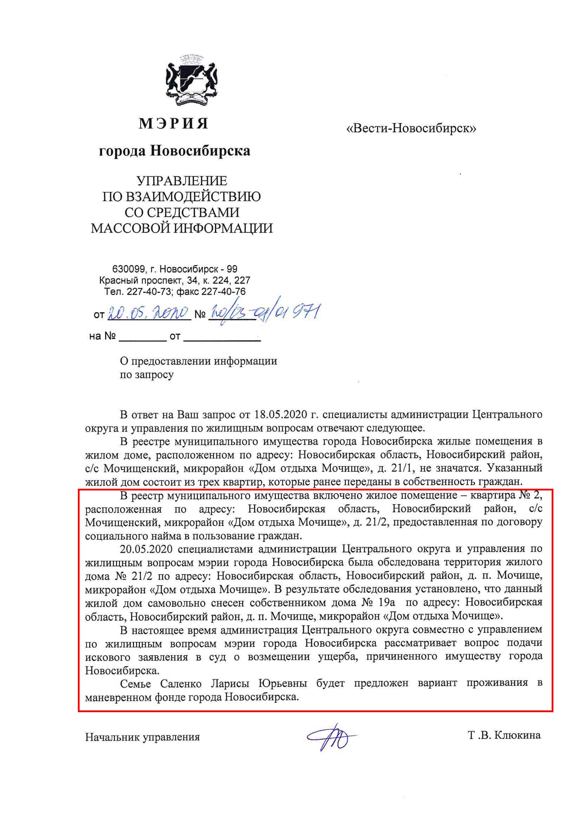 — В настоящее время администрация Центрального округа совместно с управлением по жилищным вопросам мэрии города Новосибирска рассматривает вопрос подачи искового заявления в суд о возмещении ущерба, причинённого имуществу города Новосибирска. Семье Саленко Ларисы Юрьевны будет предложен вариант проживания в маневренном фонде города Новосибирска, — говорится в ответе пресс-центра мэрии на запрос журналиста «Вести Новосибирск».